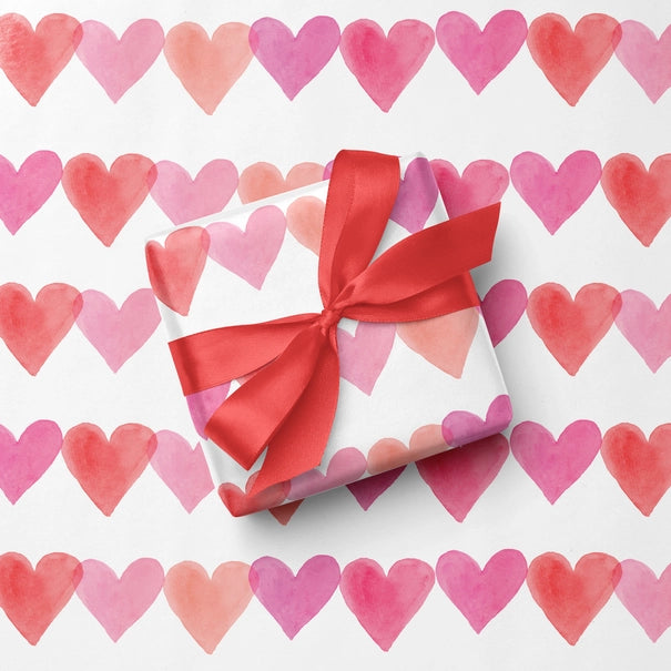 Wrapping paper sheets featuring hand-painted watercolor hearts in shades of pink and red. Perfect Valentine's Day gift wrap!